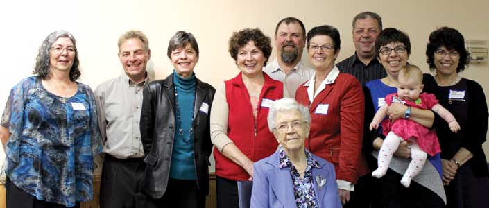 Dorothy with her nine children, (l-r) Bonna, Earl, Helen, Joyce, Neil, Nancy, Brian, Sheila (holding Hollyn, one of three great-great grandchildren at the party) and Anne.