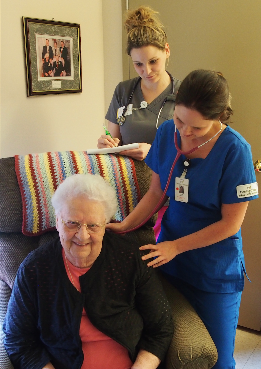 Fleming College students Jenna Maxwell (forward) Nicole Richard (back) check up on Centennial Place resident Helen Rideout.