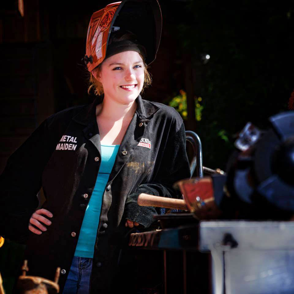 - Amanda in full welding gear with some of her designs, including a necklace made of old cutlery and her own version of Wall-E. Photo: Supplied.