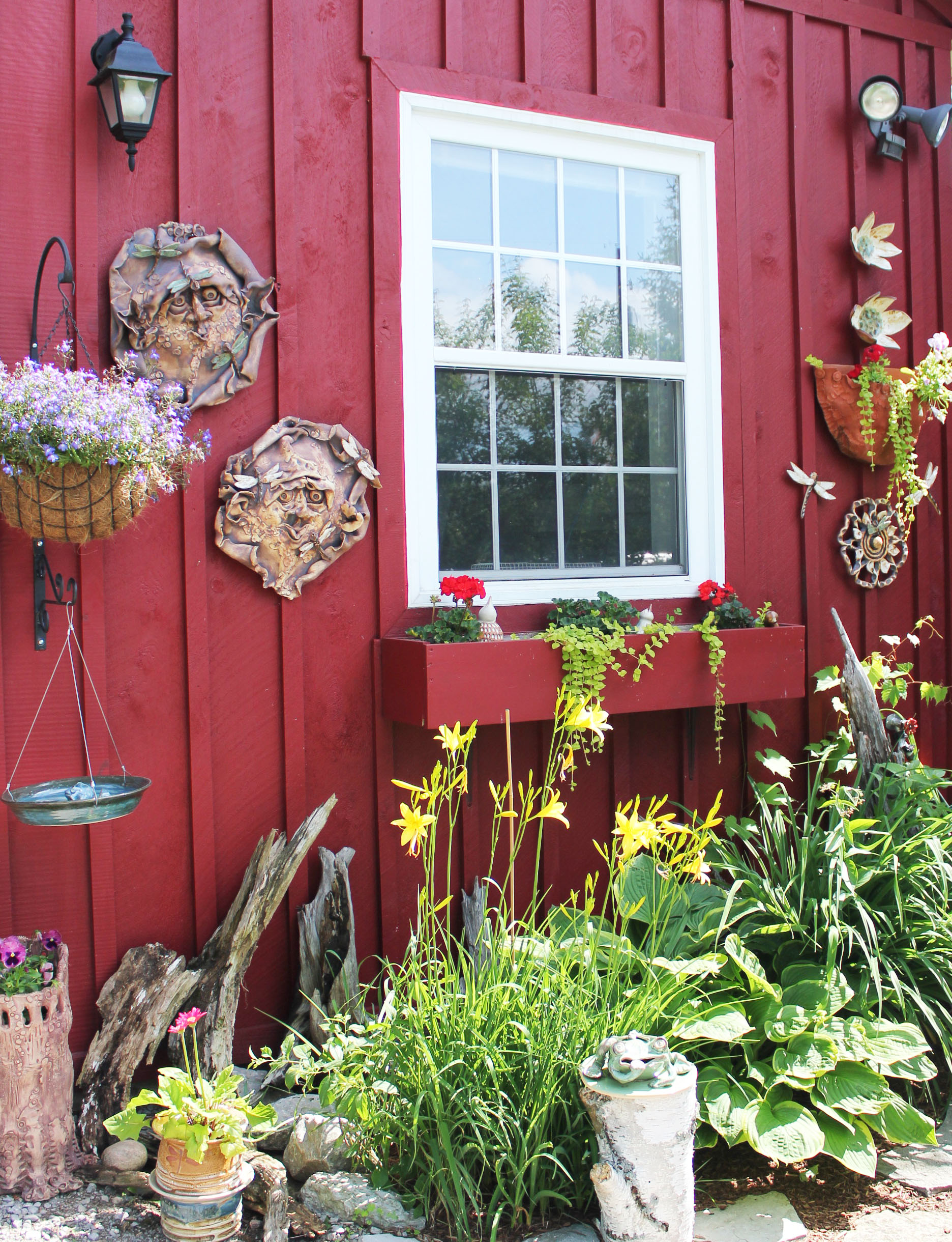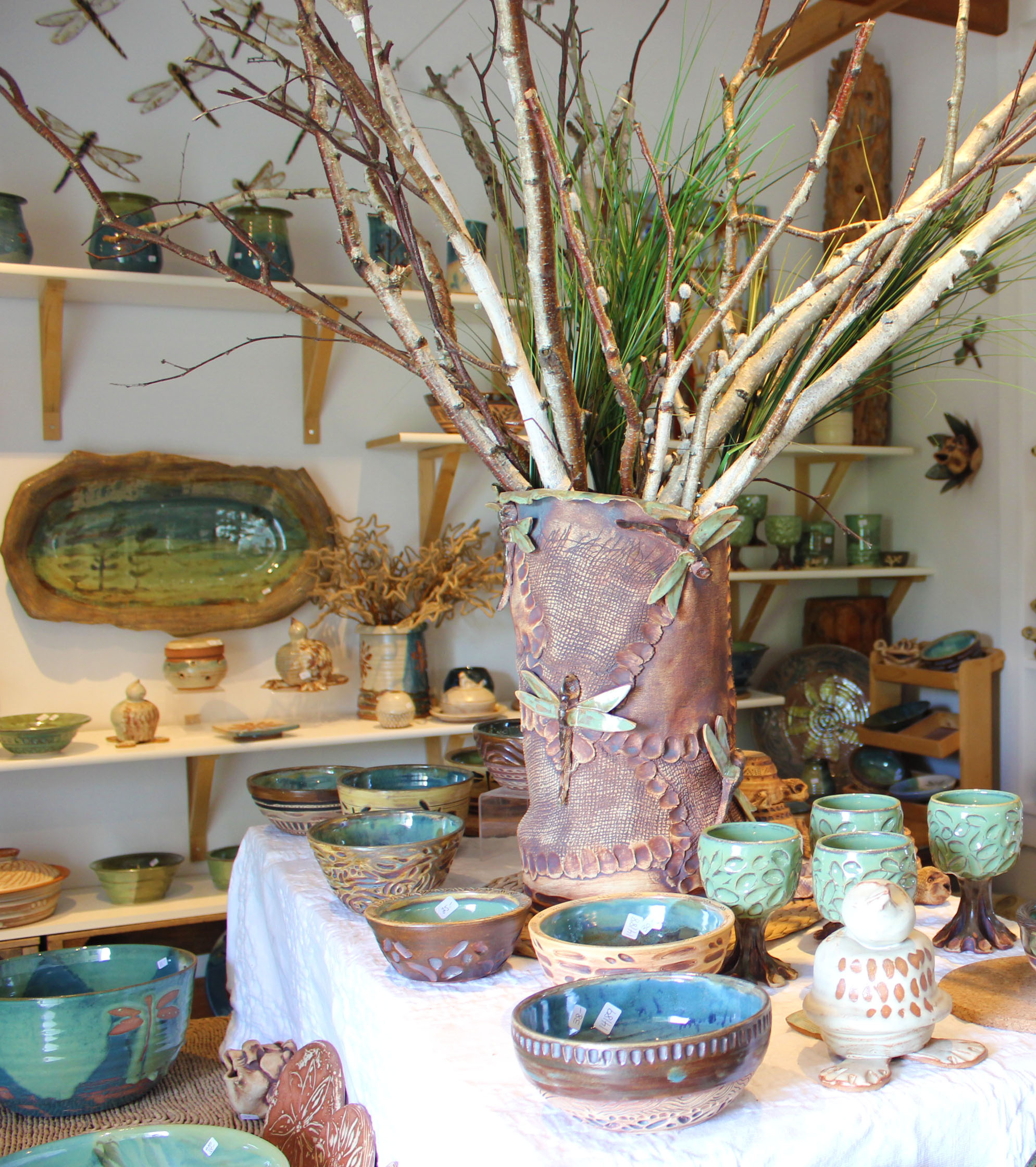Clayworks Pottery first opened in 1994 by the Georgian Bay. The business was quite successful there as her work was well admired by local cottage owners. Jodie has spent most of her years in Parry Sound. She started out by studying Fine Arts in Barrie and worked with a potter for a summer, whicheventually led her to take up the craft on her own. She was deeply inspired by the nature and scenery in her area of which is portrayed in her art through the use of blue, green, and earthy hued glazes and paint, along with the added presence of pine trees, dragonflies, birds, frogs, and toads. These Georgian Bay-inspired themes still characterize much of her work today; however, with the invigorating fields, forests, and rolling hills of the Bethany area, Jodie is finding some new influences to spark her creativity. In the near future, she hopes to start creating pieces that reflect the beautiful local scenes of this area…