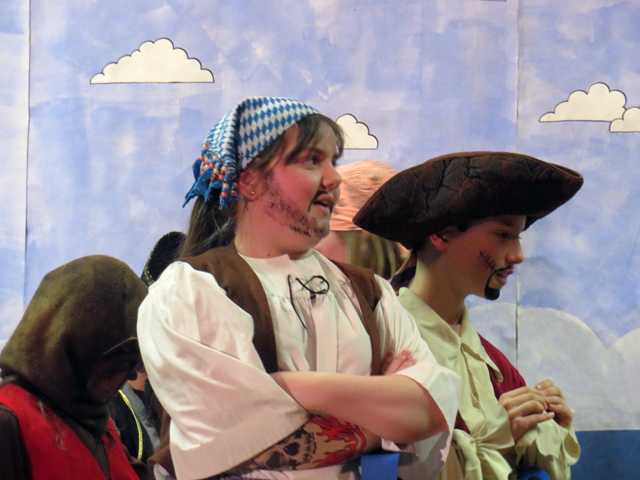 Another season of theatrics wrapped up during March break as Funfolk Theatricals demonstrated  their poise and creativity in four performances of the original play entitled The Horrible, Terrible Pirate King.  The cast of 24 aged five to fourteen embraced the story, assuming characters both noble and not, gamely joining in song when required.  Whether the actors arrived with theatrical vision and poise or acquired it as the production unfolded, all made their stage entrances with smiles (where appropriate) and presence.  Doing so required meeting a multitude of challenges: delivering timely punchlines; holding the appropriate pose and expression of their character; projecting their voices and maintaining their composure throughout the play.